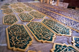 – قِطَع (الأفريز) الزخرفيّ أو ما يُصطلح عليه بـ(الكلوي)، الذي يقع بين الكتيبتَيْن القرآنيّة والشعريّة العلويّتَيْن، ويكون على شكل حرف (S)، منقوشةٌ عليه يدويّاً نقوشٌ نباتيّة وسيكون طلاؤه كاملاً بالذهب الخالص أيضاً.