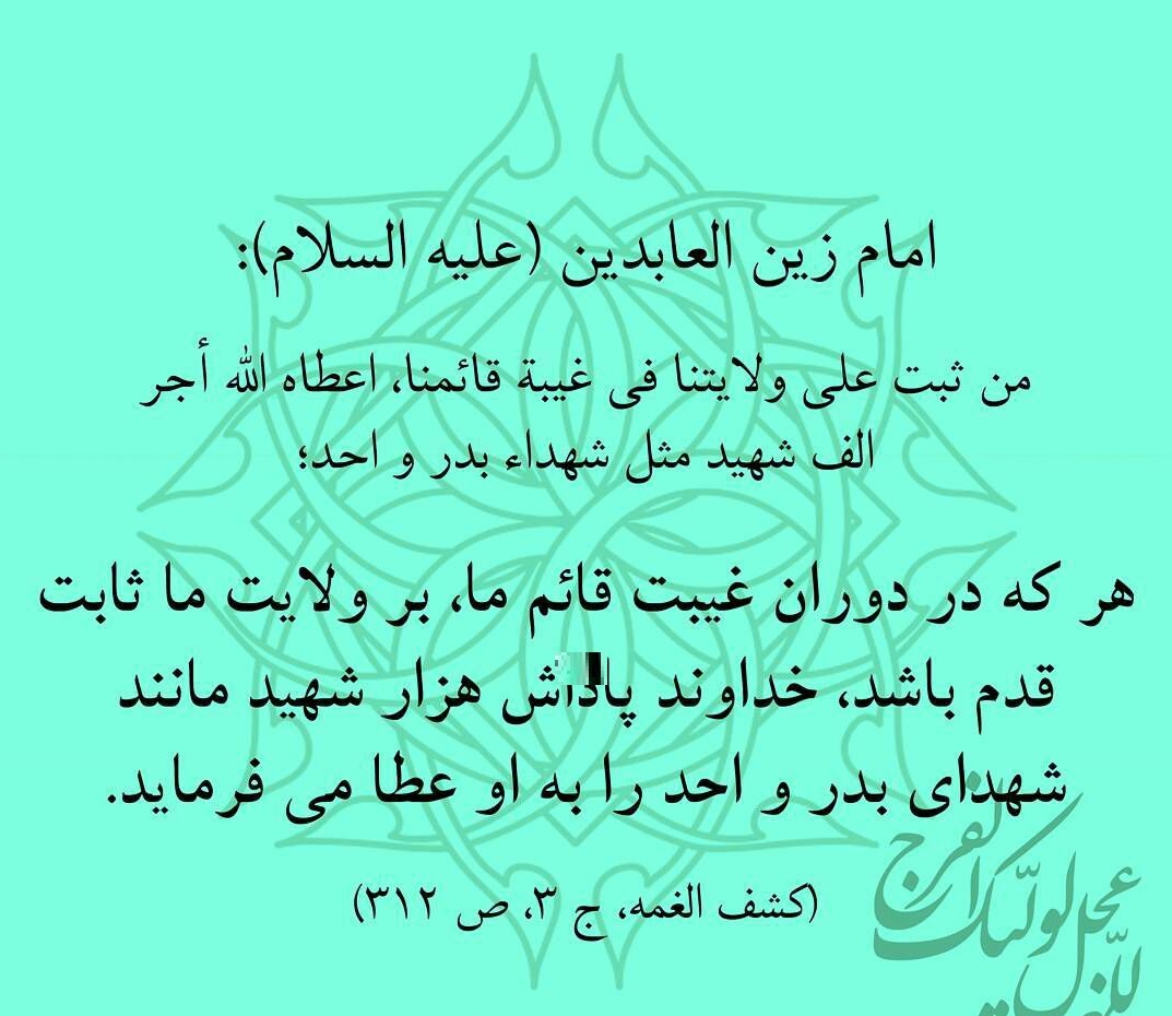 حديث اليوم الامام زین العابدین علیه السلام By منتظر On أغسطس 5, 2017 0 Share من ثبت على ولایتنا فی غیبه قائمنا أعطاه الله أجر ألف شهید مثل شهداء بدر واحد«کشف الغمه ج۳ص۳۱۲» أجر ألف شهيدالامام زين العابدين عليه السلامشهداء بدرمن ثبت على ولايتنا 0 Share FacebookTwitterGoogle+ReddItWhatsAppPinterestEmail