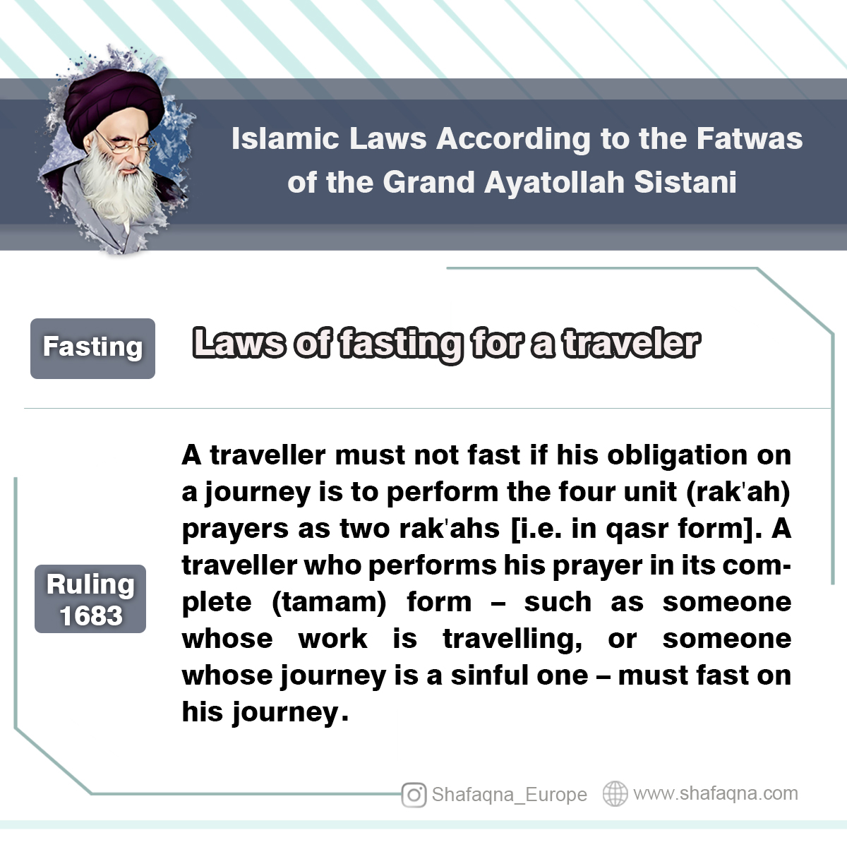 Ruling 1683: A traveller must not fast if his/her obligation on a journey is to perform the four unit (Rakʿah/Ruk’ah) prayers as two Rakʿahs [i.e. in Qasr form]. A traveller who performs his/her prayer in its complete (Tamam) form – such as someone whose work is travelling, or someone whose journey is a sinful one – must fast on his/her journey.
